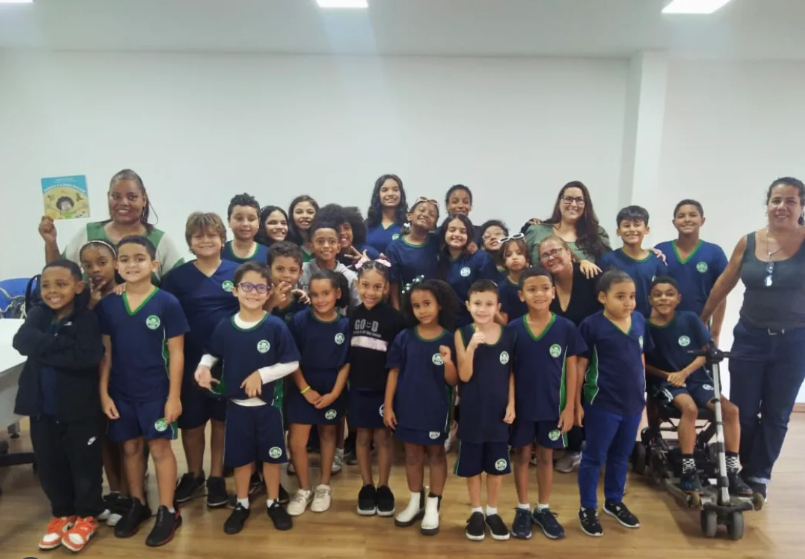 Na última quarta-feira, dia 14/05/2025, fui à Biblioteca Milton Santos, em Jacarepaguá (RJ), para uma contação de histórias do livro “Gustavo e a bolha dourada“. Lá, eu recebi a CEJA, uma escola dos arredores da biblioteca, com crianças do 1º ao 5º ano do Ensino Fundamental.
